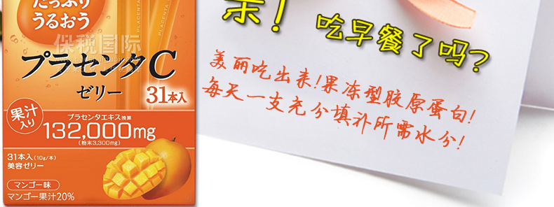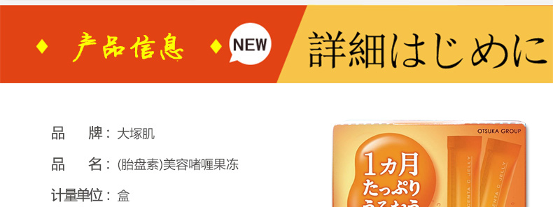 新版大塚肌C膠原蛋白+VC+玻尿酸(胎盤素)美容啫喱果凍31條/盒—— 1、成分:胎盤素精華132000mg,低分子膠原蛋白6600mg燕窩精華111mg彈性蛋白220mg維他命c465mg天竺提取物111mg; 2、肌C美顏口服啫喱系列是日本人氣熱賣的美顏補充品,是唯一一款含有胎盤素精華及骨膠原蛋白的口服啫喱,獨立包裝,無糖低卡,只需7日,便可顯著改善面部暗啞膚色、細紋和色斑等肌膚問題,全面提升皮膚質素,重現肌膚年輕緊緻柔滑。 |