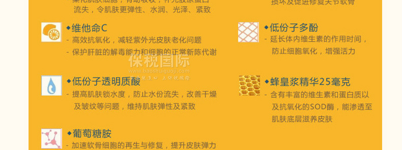 補水、保濕、美白、抗氧化、修復受損肌膚 |