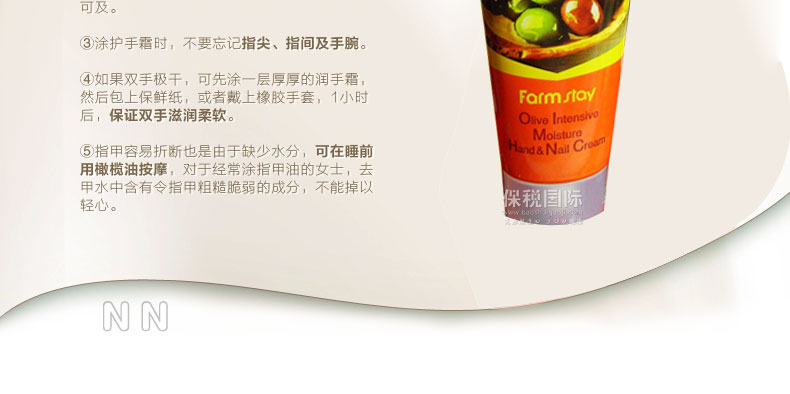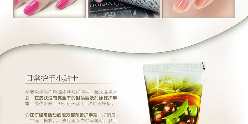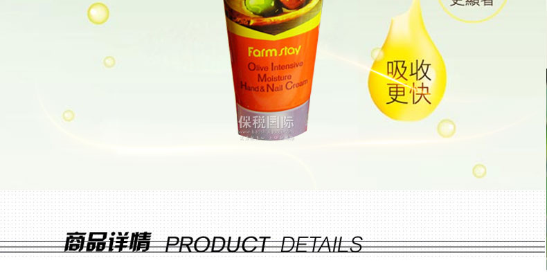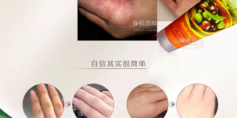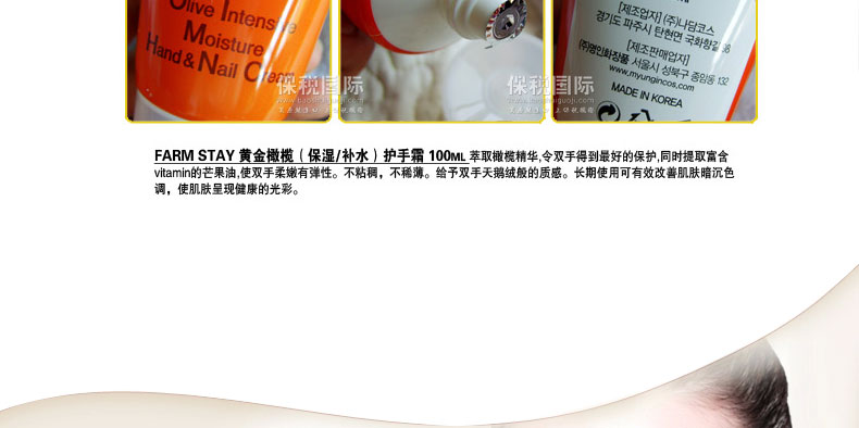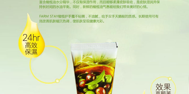 FARM STAY明人 橄欖油男女通用護(hù)手霜 美白滋潤 保濕修復(fù) 100g/支—— 富含橄欖油水分精華,不僅有保濕作用,而且能夠柔滑皮膚吸收,是皮膚濕潤并保持長時間的水油平衡。同時,新鮮的橄欖油氣息能給我們帶來美好的心情。 |