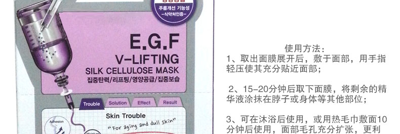 韓國(guó)TOPFACE EGF V-LIFTING瘦臉蠶絲面膜—— [注意事項(xiàng)]1、本產(chǎn)品之主要成分皆為天然萃取,但現(xiàn)代人很多都有過(guò)敏體質(zhì),對(duì)于天然物質(zhì)亦可能產(chǎn)生過(guò)敏現(xiàn)象,故使用前務(wù)必于手臂內(nèi)側(cè)測(cè)試10分鐘后,于隔日如無(wú)過(guò)敏現(xiàn)象,再行使用。 ????????? 2、敏感性肌膚請(qǐng)先詢問(wèn)醫(yī)師;使用時(shí)肌膚若有不適,請(qǐng)立即停止使用,并請(qǐng)教醫(yī)師。 ????????? 3、請(qǐng)勿長(zhǎng)時(shí)間將面膜敷蓋臉上。 ????????? 4、當(dāng)肌膚有傷口或紅腫,曬傷等情形發(fā)生時(shí),請(qǐng)勿使用。 ????????? 5、請(qǐng)勿觸碰到眼睛,萬(wàn)一不慎觸碰到眼睛,請(qǐng)立即用清水沖洗。 ????????? 6、為確保質(zhì)量,鋁袋開(kāi)封后請(qǐng)立即使用完畢。 使用方法:1、取出面膜展開(kāi)后,敷于面部,用手指輕壓使其充分貼近面部; ????????? 2、15-20分鐘后取下面膜,將剩余的精華液涂抹在脖子或身體等其他部位; ????????? 3、可在沐浴后使用,或用熱毛巾敷面10分鐘后使用,面部毛孔充分?jǐn)U張,更利于肌膚吸收面膜中的營(yíng)養(yǎng) |