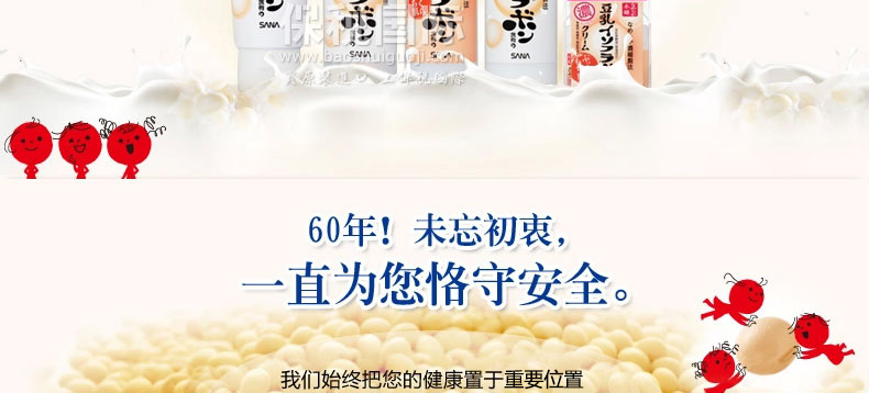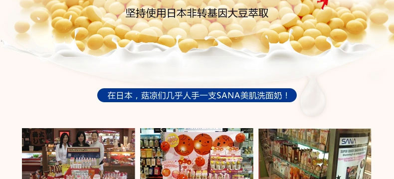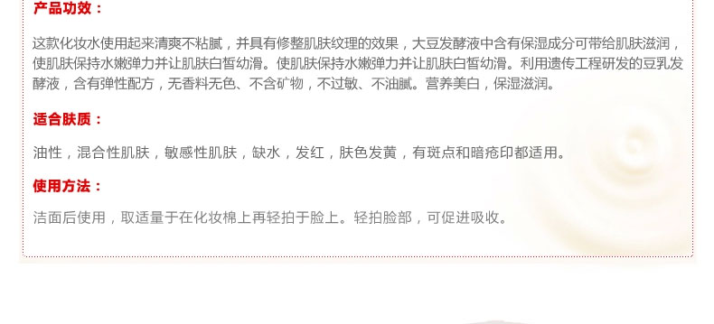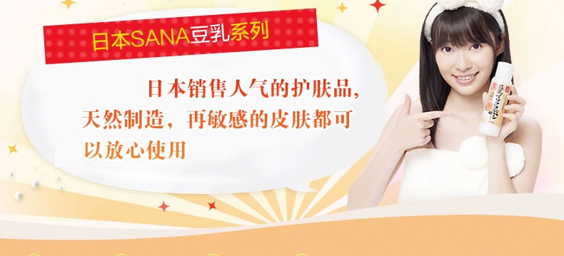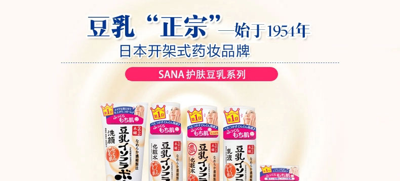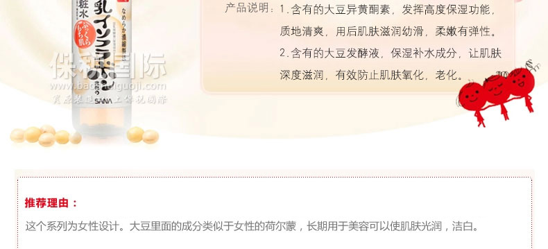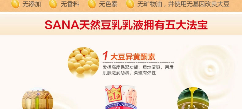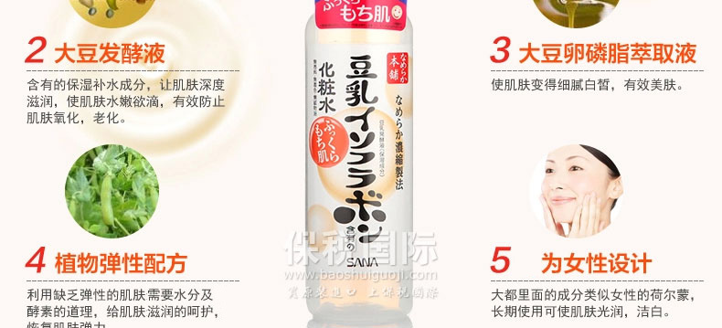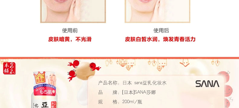 日本 sana豆乳化妝水 美膚保濕水 美肌爽膚水 濃潤滋潤水 200ml/瓶—— 1.含有的大豆異黃酮素,發揮高度保濕功能,質地清爽,用后肌膚滋潤幼滑,柔嫩有彈性。 2.含有的大豆發酵液,保濕補水成分,讓肌膚深度滋潤,有效防止肌膚氧化,老化。 3.大豆卵磷脂萃取液,讓肌膚變得細膩白皙,更有效美膚。 4.無添加、無香料、無色素、無礦物油、使用無基因改良大豆。 5.為女性設計,大豆里面的成分類似女性的荷爾蒙,長期使用可以使肌膚光潤,潔白。 注:敏感肌膚慎用,可隱蔽處進行皮膚測試后使用。 |