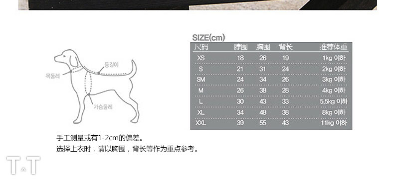 韓國【Its Dog】時尚高領狗狗連體衣—— 1、時尚亮片胸針設計,可拆卸,可搭配在衣服任何部位,增添時尚感; 2、精致的包邊,耐磨,耐臟,舒適保暖; 3、開叉領子設計,寶貝穿著不憋悶; 4、優質面料,針織與牛仔布的結合,不僅舒適保暖,更能穿出時尚俊俏感; 5、質量保證,做工精細,每一處針腳都平順、整齊,踩線均勻。 6、衣衣測量方法 胸圍:狗狗前腿后繞身體一周,也就是前胸最寬處(類似于人量胸圍) 身長:狗狗后背的直線長度(不包括頭/頸/尾) 胸圍通常比身長多10CM左右,體形越大的狗狗因為相差越多,對于毛發蓬松的狗狗,量胸圍的時候不要太壓毛發。