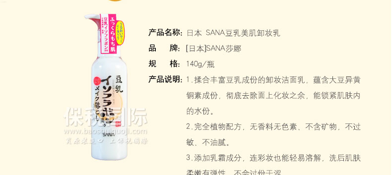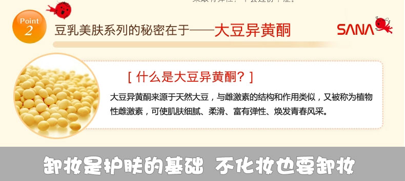日本 SANA豆乳美肌卸妝乳 深層清潔保濕卸妝液 孕婦可用 —— 1.揉合豐富豆乳成份的卸妝潔面乳,蘊含大豆異黃銅素成份,徹底去除面上化妝之余,能鎖緊肌膚內的水份。 2.完全植物配方,無香料無色素、不含礦物,不過敏、不油膩。 3.添加乳霜成分,連彩妝也能輕易溶解,洗后肌膚柔嫩有彈性,不會過份干澀。 |