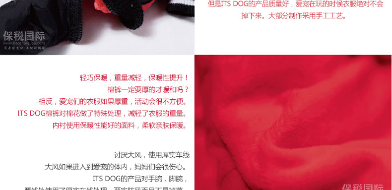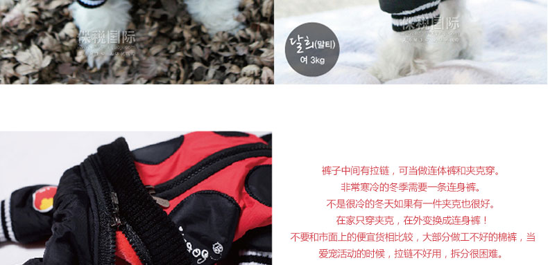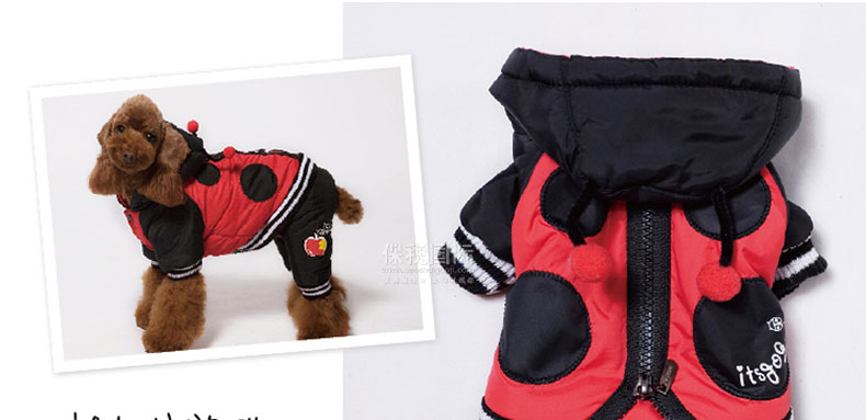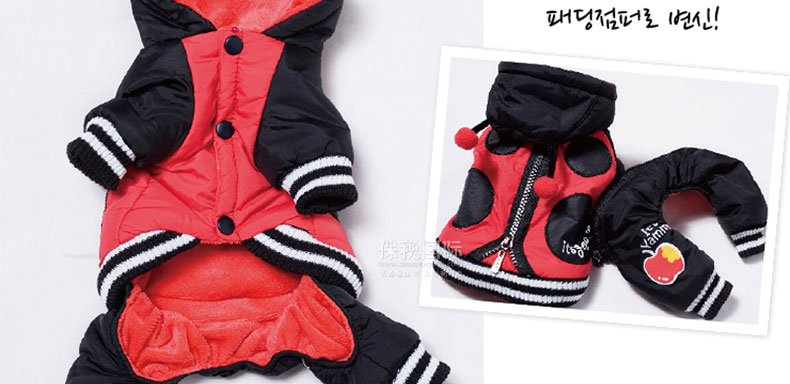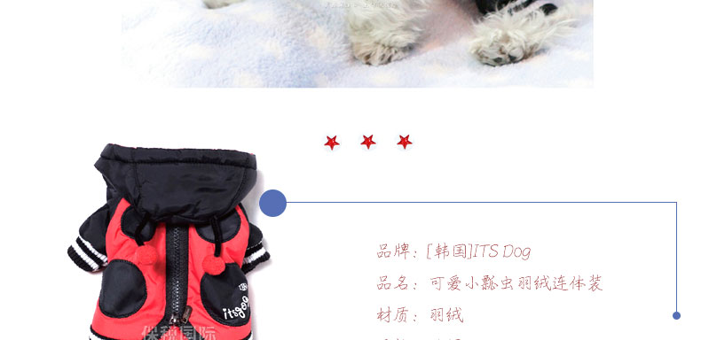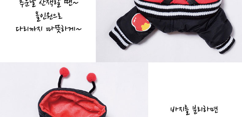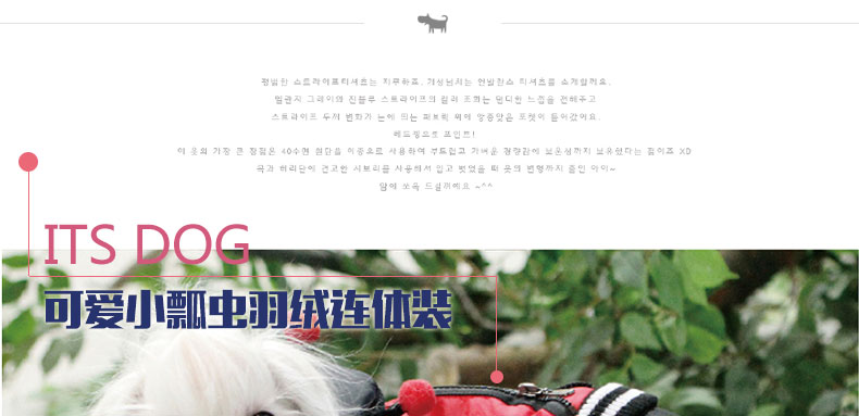 韓國【Its Dog】可愛小瓢蟲可分體穿羽絨連體裝—— 1、ITS DOG的拉鏈設計,可當做夾克和連身褲穿,和市面上廉價的連身褲相比,ITS DOG的品質更出眾,精致的拉鏈設計,品質有保證,狗狗穿著外出活動也不易掉落; 2、對面料做了特殊處理,減輕了衣服的重量,提升了衣服的保暖性能; 3、對手腕,腳腕,腰線處的車線做了厚實處理,非常防風保暖。
