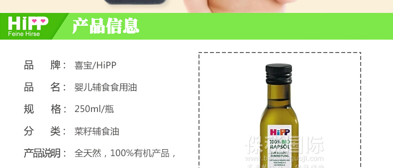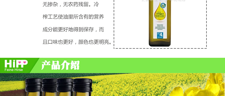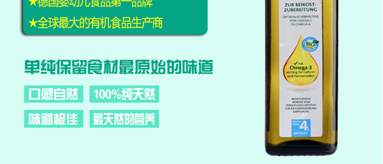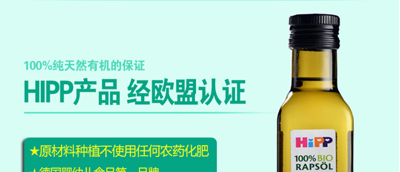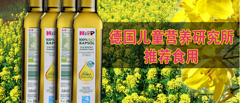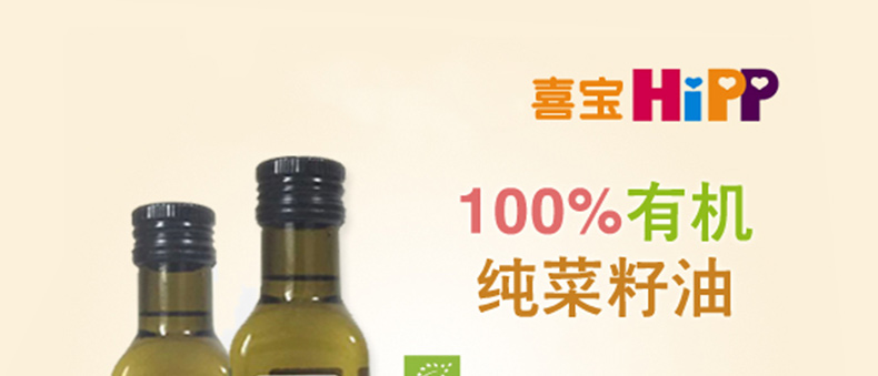 Hipp喜寶 嬰兒輔食 有機(jī)食用油/菜籽油 飯菜更可口 250ml/瓶 —— 全天然,100%有機(jī)產(chǎn)品,無摻雜,無農(nóng)藥殘留。冷榨工藝使油里所含有的營養(yǎng)成分能更好地得到保存,而且口味也更好,顏色也更明亮。寶寶們可以放心食用。 |