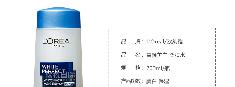 歐萊雅L'Oreal white perfect雪顏美白化妝水 滋潤保濕柔膚水 白皙透明爽膚水(200ml/瓶)—— 1.含有效抑黑成份,從根本成因著手,防止膚色變深,淡化色斑。 2.輕柔爽潔,雪顏三重美白柔膚水能即刻被肌膚吸收,肌膚頓感舒適。 注:敏感肌膚慎用,可隱蔽處進行皮膚測試后使用。 |