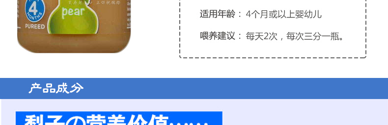 亨氏Heinz 梨泥嬰兒輔食 不含防腐劑 天然美味—— 1.輔食不含防腐劑,請開蓋后在3天內用完。 2.采用100%天然優質材料,專為4個月以上寶寶設計。 3.食用方法簡單快捷,出外或家里都非常方便。 4.不含牛奶、雞蛋!避免寶寶過敏。 喂養建議:每天2次,每次三分一瓶。 |