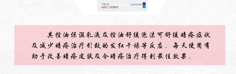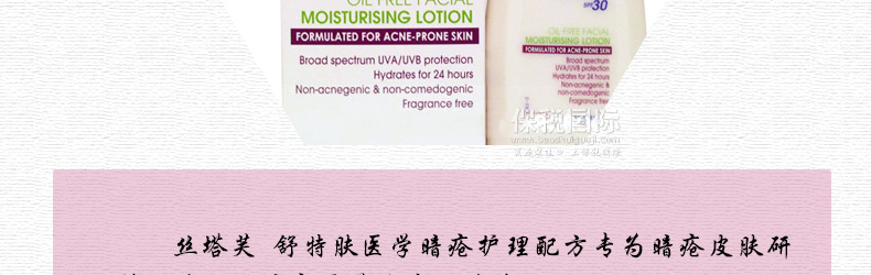 Cetaphil絲塔芙 舒特膚醫學暗瘡護理保濕乳液 控油保濕乳SPF30 —— 1、提供即時保濕,有效二十四小時。 2、備有神經酰胺技術幫助修護皮膚屏障。 3、全新Oleosome技術提供全面高效防曬及輕型效果。 4、含葡萄糖酸鋅及二氧化矽可有效控制油光。 5、可每天使用或暗瘡治療一并使用,減少治療時肌膚發紅干燥及粗糙等刺激敏感現象。 使用方法:搽上適量舒特膚醫學暗瘡護理配方之控油保濕乳液于面上,頸部及控油保濕乳液于面上,頸部及光敏感部分。若長時間于陽光下,請于適當時重新涂上。建議配合控油舒緩潔面泡沫使用,可更有效調節油脂分泌及促進皮膚屏障功能。 |