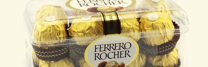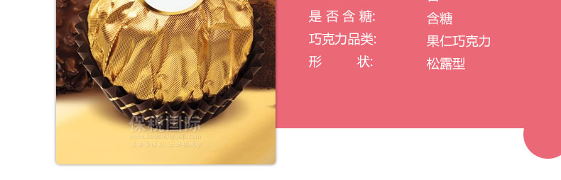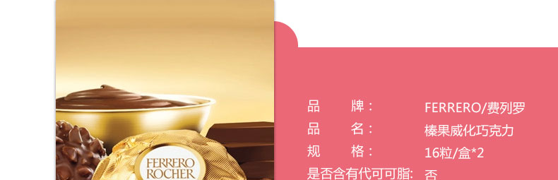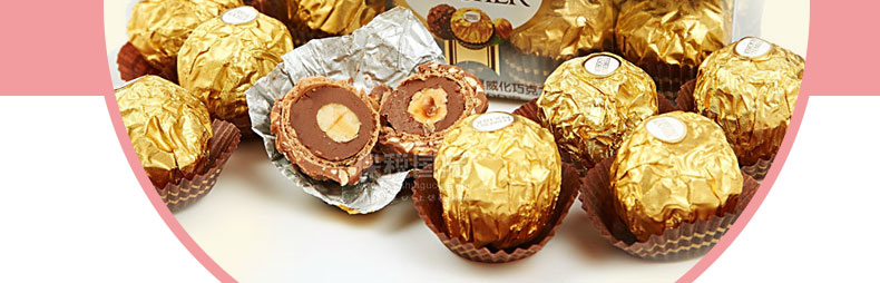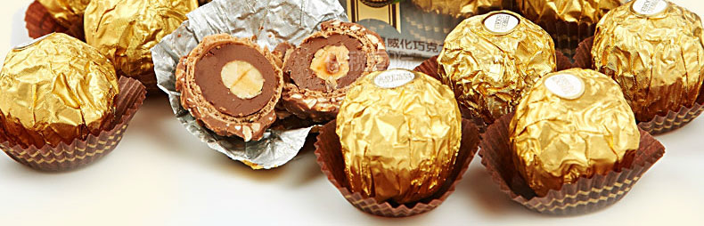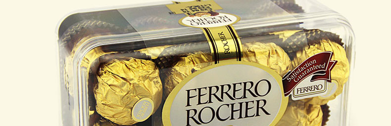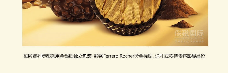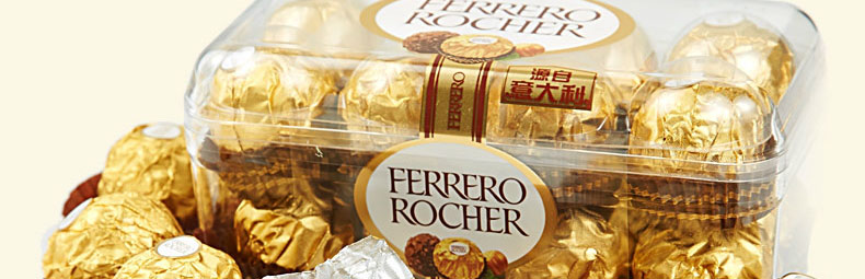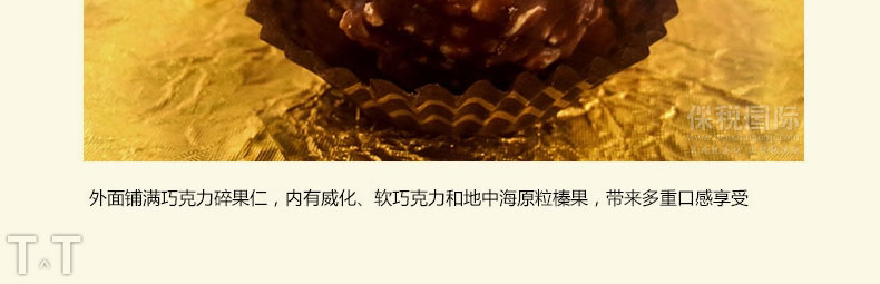 意大利 費列羅FERRERO 榛果威化巧克力 16粒/盒 兩盒裝 T16—— 1.每顆ROCHER選用金箔紙獨立包裝,陳列在透明禮盒內,意念新穎獨特,裝潢典雅華貴。盒蓋上燙金標貼須清楚印有的FERRERO ROCHER字樣。 2.每顆巧克力及盒蓋上燙金標貼須清楚印有的FERRERO ROCHER字樣;產品標簽清楚印有“費列羅產品”橢圓標志和“原產國:意大利”字樣,此外FERRERO ROCHER并沒有在國內合資或授權生產。 |