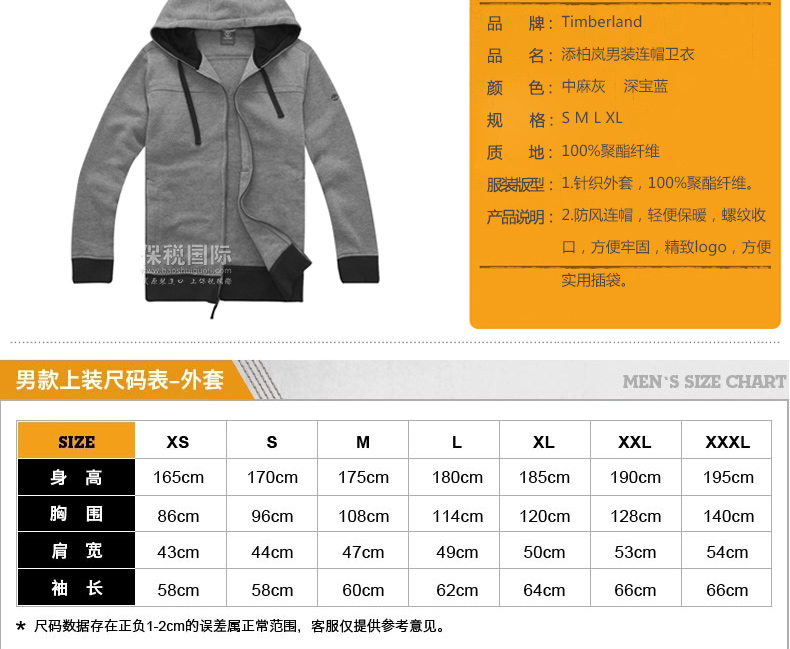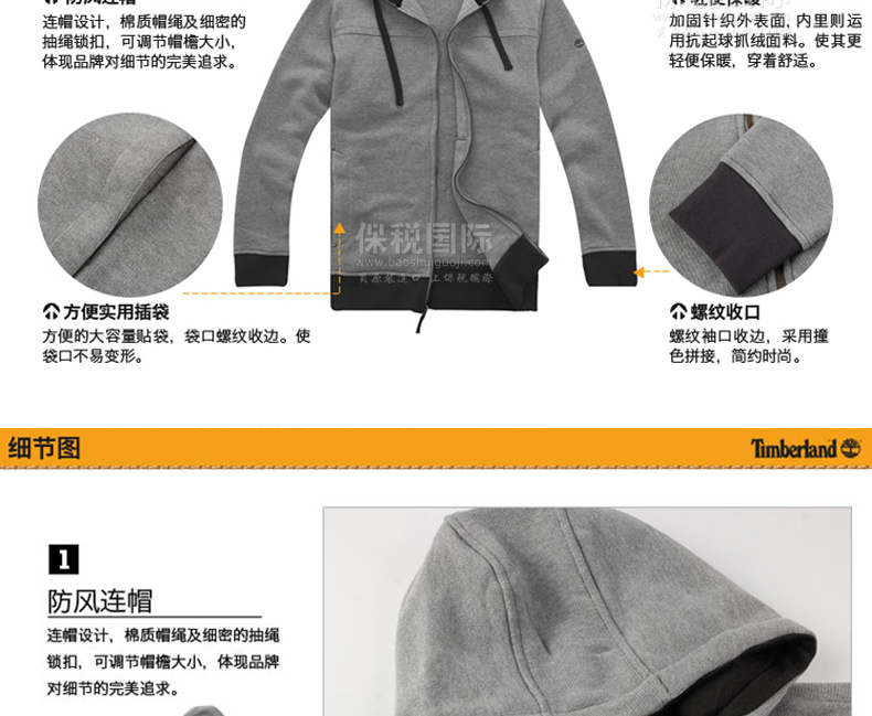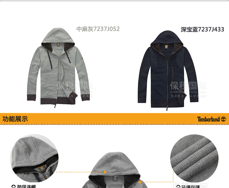 Timberland/添柏嵐男裝新款 抓絨連帽衛(wèi)衣 中麻灰7237J052 深寶藍(lán)7237J433—— 1.針織外套,100%聚酯纖維。 2.防風(fēng)連帽,輕便保暖,螺紋收口,方便牢固,精致logo,方便實(shí)用插袋。 |