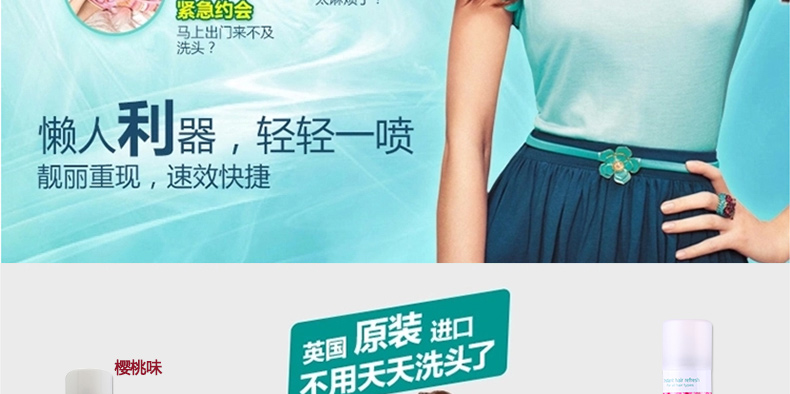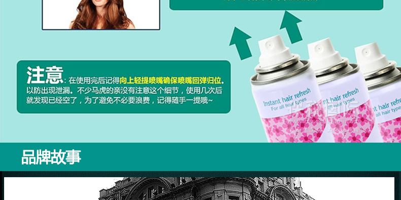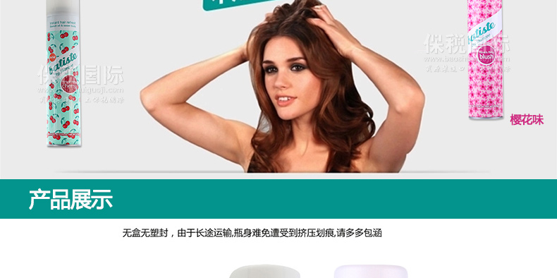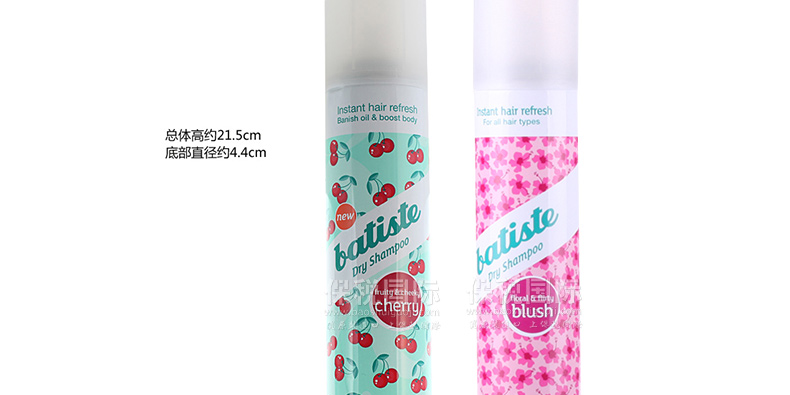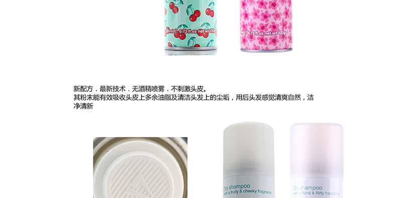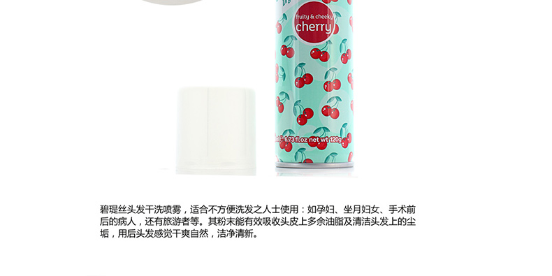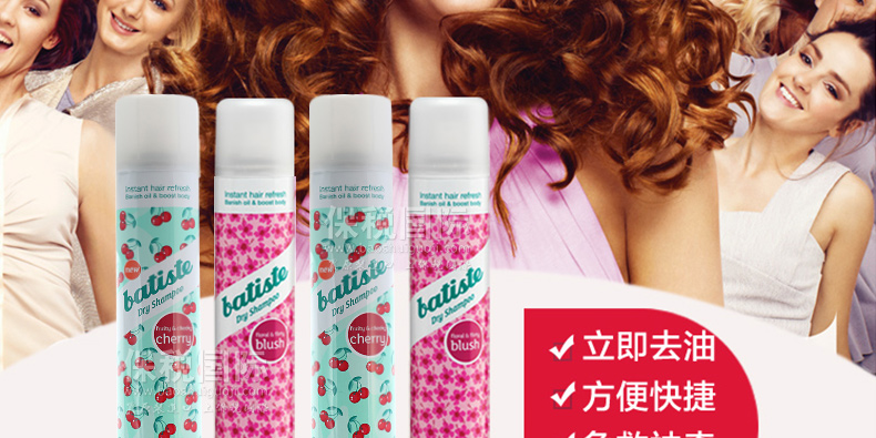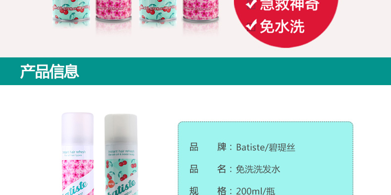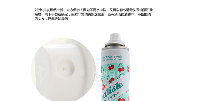 碧緹絲batiste 免洗洗發(fā)水 頭發(fā)干洗噴霧 經(jīng)期孕婦月子均可用(200ml/瓶)—— 1.噴霧噴到頭發(fā)上會有一層白色粉末。這是由于噴霧內(nèi)含有米淀粉和滑石粉的緣故。并不是產(chǎn)品質(zhì)量問題。 2.全新技術(shù),不含酒精噴霧,不刺激頭皮,安全快捷,方便!無需用水,即可將頭發(fā)上的污垢潔凈并滋養(yǎng)發(fā)絲。 |