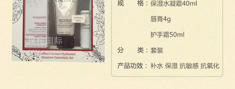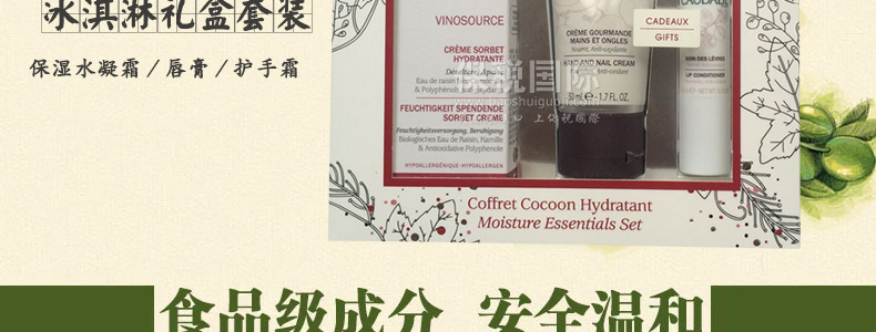 法國 歐緹麗Caudalie 葡萄籽瑩潤保濕水凝霜 唇膏 護(hù)手霜 冰淇淋禮盒套裝 —— 1.強(qiáng)大產(chǎn)品力不僅通過嚴(yán)苛的歐美臨床測試,并且深受90%使用過的歐美女性歡迎。 2.能立即鎮(zhèn)靜并舒緩肌膚,且效果持久。它可重新激活肌膚的儲(chǔ)水機(jī)制和自身防御系統(tǒng),恢復(fù)肌膚含水量。 |