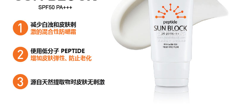 韓國FACERE PEPTIDE防曬隔離霜60ml SPF50 PA+++—— 1、含低分子PEPTIDE,滲透力強,增加皮膚彈性防止老化; 2、有效遮擋導致皮膚老化的元兇UV紫外線,抗氧化。防衰老 3、含有天然提取物,超強保濕,刺激性低,敏感性及過敏性皮膚均可使用。 使用說明:外出前,做完臉部基礎護理后,取適量均勻的涂抹于臉部,額頭、鼻梁、頰骨部位要仔細涂抹并拍打。使用時不要滲入眼中。 保存方法:使用后,把瓶口清理干凈密封常溫保存。 |