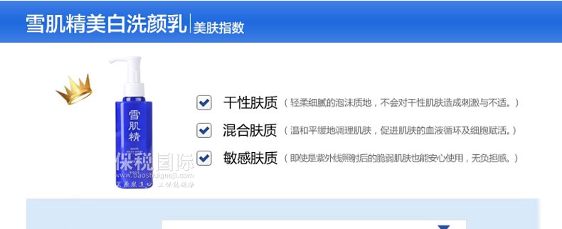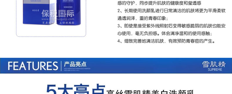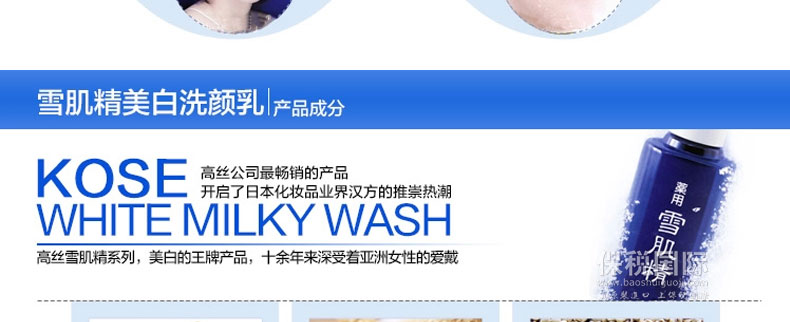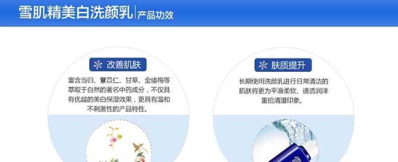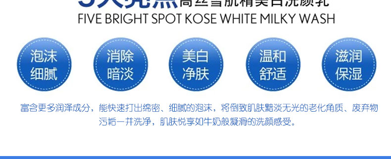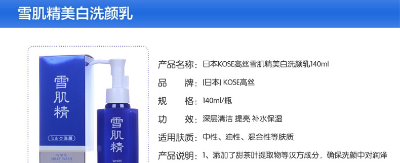 日本KOSE高絲雪肌精美白洗顏乳140ml—— 1、添加了甜茶葉提取物等漢方成分,確保洗顏中對潤澤感的守護,同步提升肌膚的健康度和瑩透感; 2、長期使用洗顏乳進行日常清潔的肌膚將更為平滑柔軟,通透潤澤,重拾青春印象; 3、即使是接受紫外線照射后變得敏感脆弱的肌膚也能安心使用,毫無負擔感。體會清凈溫和的使用感觸; 4、細致完善地清潔肌膚,有效預防青春痘的產生。 使用方法:將手部及臉部沾濕,按壓1~2次的量于手掌,加水或溫水輕輕搓揉起泡后洗臉,之后請充分將泡沫沖凈。 |