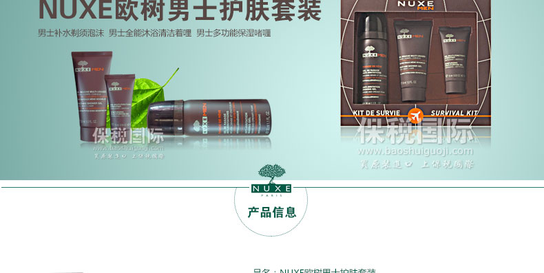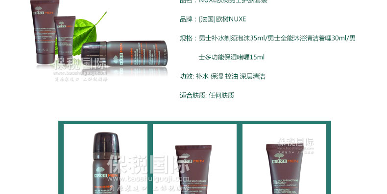 NUXE歐樹 樹木能量男士護(hù)膚套裝 全能保濕潔面旅行套裝—— NUXE男士補(bǔ)水剃須泡沫35Ml 溫和的質(zhì)地,乳脂狀的泡沫,輕柔、極好的覆蓋力。 男士全能沐浴清潔啫哩30ML 三效合一,一次就可清潔臉部、身體和頭發(fā),適合男士快速應(yīng)對的需要。 男士多功能保濕啫喱15ml 保濕凝露匯集三重功效:保濕,增加肌膚活力和改善膚色。完美的保濕效果,可使肌膚恢復(fù)活力和彈性。 |