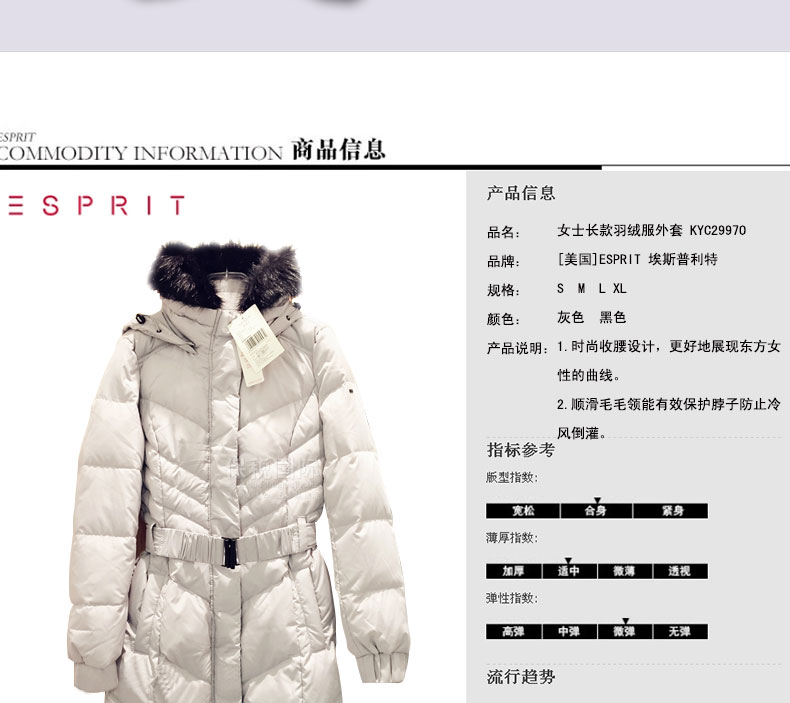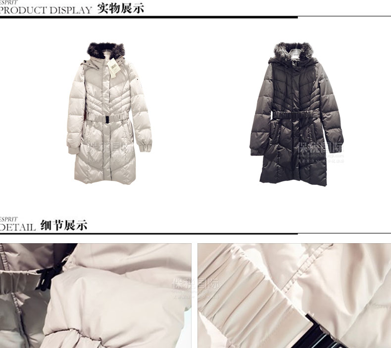 ESPRIT埃斯普利特女士長款羽絨服外套 KYC2997O 收腰設計—— 1.時尚收腰設計,更好地展現(xiàn)東方女性的曲線。 2.順滑毛毛領能有效保護脖子防止冷風倒灌。 |