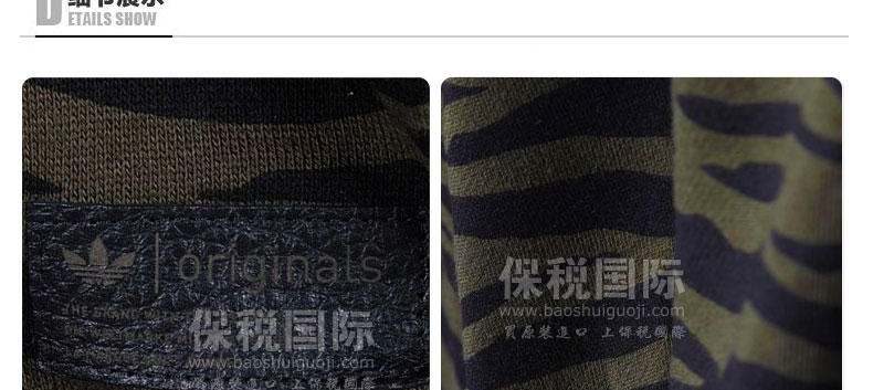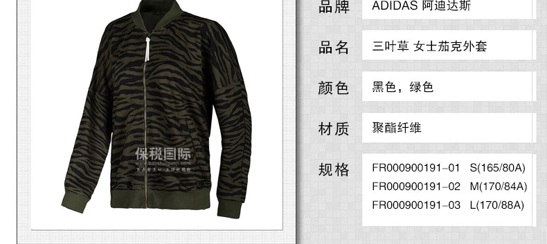阿迪達(dá)斯Adidas 三葉草 Tiger Camo Track 女士茄克外套 夜空綠—— 1.羅紋袖口拼接,邊緣做工精致,展現(xiàn)經(jīng)典中的個(gè)性。 2.采用優(yōu)質(zhì)棉滌面料,質(zhì)地柔軟,舒適,透氣,不易變形。 |
