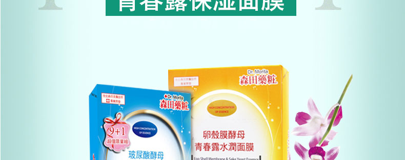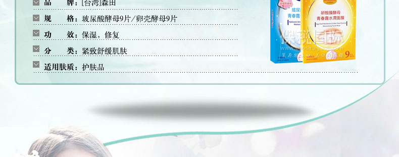 臺灣森田藥妝 玻尿酸酵母/卵殼酵母青春露保濕水潤面膜9片 |