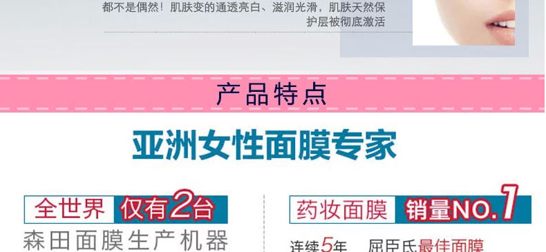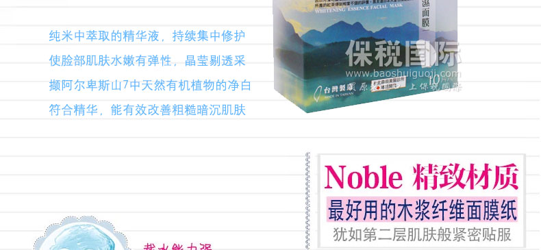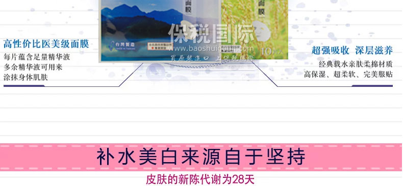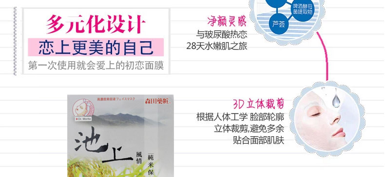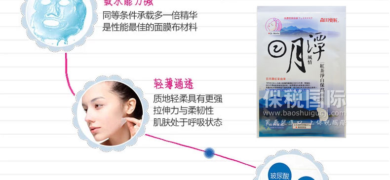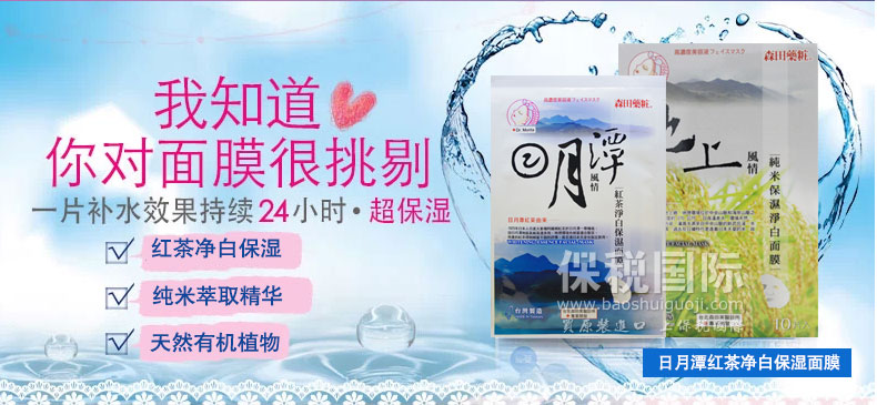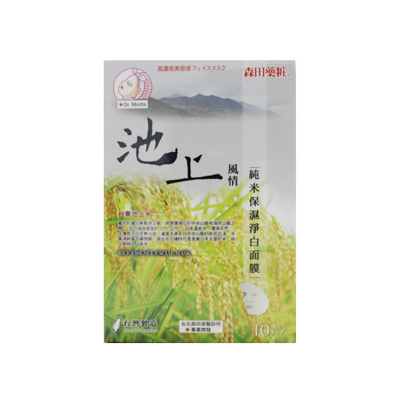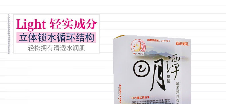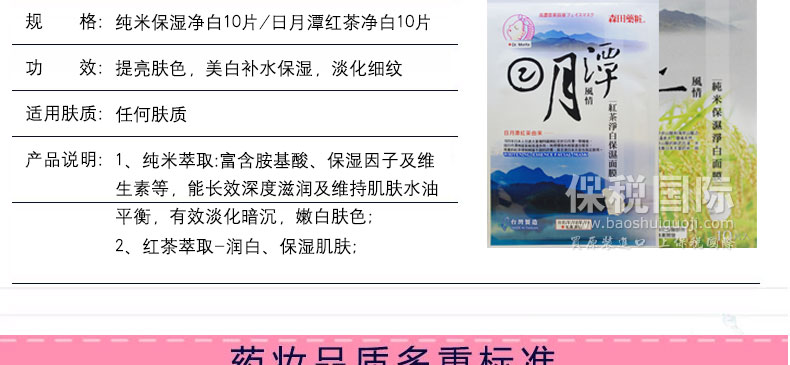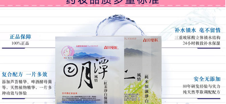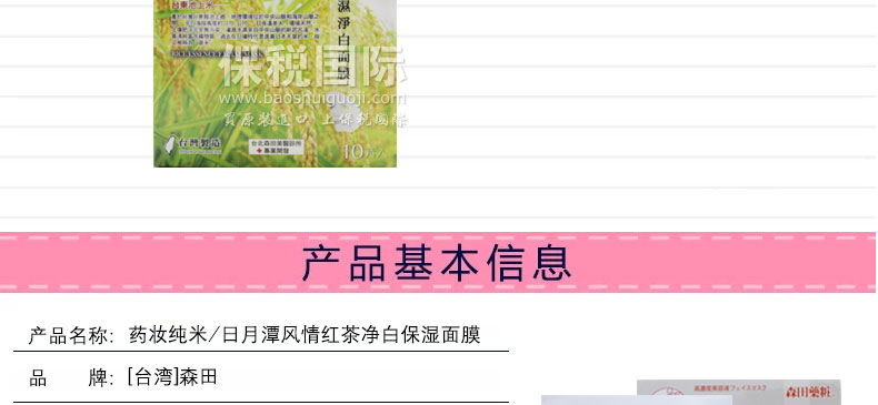 臺灣森田藥妝純米/日月潭風情紅茶凈白保濕面膜10片—— 1、純米萃取:富含胺基酸、保濕因子及維生素等,能長效深度滋潤及維持肌膚水油平衡,有效淡化暗沉,嫩白膚色; 2、紅茶萃取-潤白、保濕肌膚; 3、有機綠茶-含有豐富兒茶素,具凈白、保濕、調理、防護肌膚功效; 4、有機山花精-是采擷阿爾卑斯山七種天然有機植物的凈白復合精華,能有效改善粗糙暗沉的肌膚; 5、玻尿酸-超保濕因子,可持續全天全面鎖水,避免水分流失,能讓肌膚水嫩、緊致有彈性。