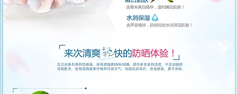 Olay 玉蘭油 防曬凈白乳霜SPF19 滋潤保濕 多效美白霜—— 1.保濕的甘油(Glycerin)成分,自然溫和,長時間持續(xù)使用滋潤,讓肌膚展現(xiàn)柔滑光澤。 2.內(nèi)含Niacinamide(維他命B3),維他命B5及維他命E,深入肌膚,讓肌膚從內(nèi)均勻白皙。 使用方法:早晚一次 取適量 涂于面上及頸上。 |