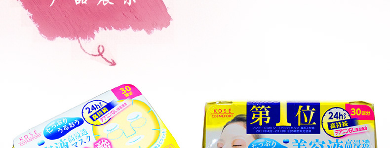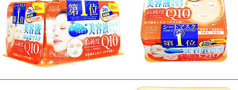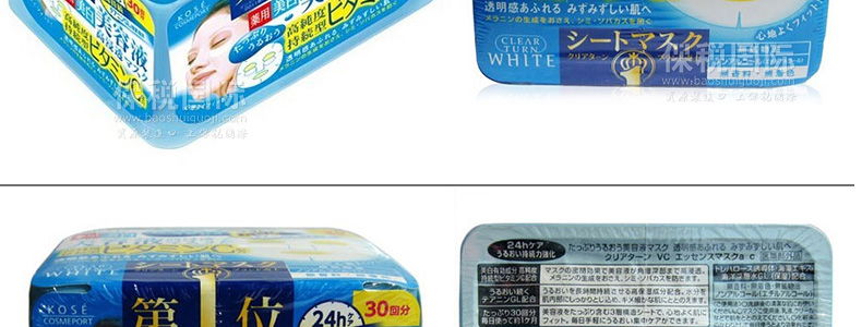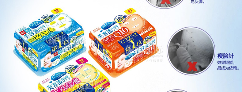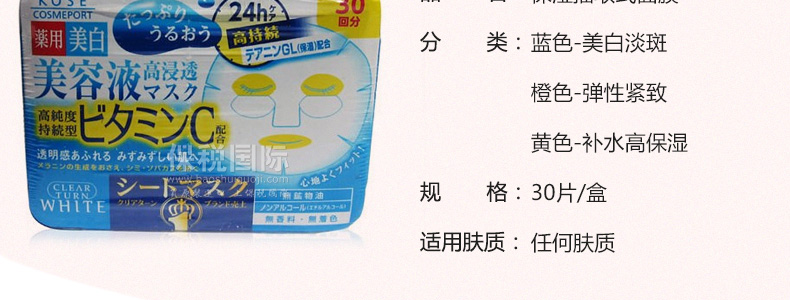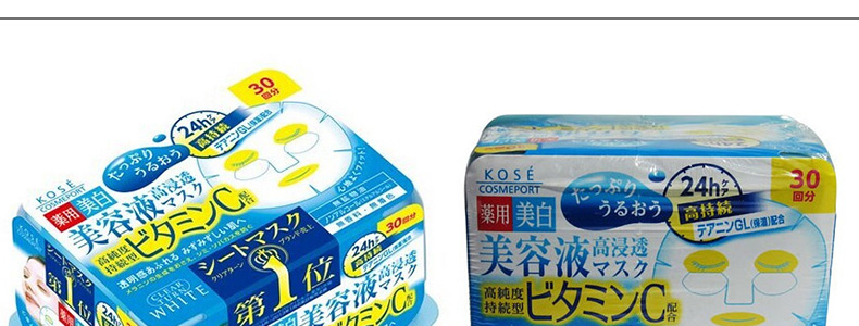 日本 KOSE高絲補水保濕抽取式面膜 美白淡斑/彈力緊致/補水高保濕 面膜—— 【美白保濕】薏仁白皙保濕美容液面膜(藍色):薏仁白皙保濕美容液面膜,高純度的水融性維他命C美白成分,加速色素的分解,天然桑萁及檸檬萃取液可以平衡肌膚,幫助美白成分迅速滲透至皮膚基底層,將不良代謝物推出體外變成老舊角質脫落,對黃褐斑、蝴蝶斑、暗瘡遺印均有良好的淡化效果,及時補充肌膚水分及養分令肌膚晶瑩通透,雪肌動人。 【彈性緊致】Q10超緊實提拉保濕美容液面膜:肌膚緊致的關鍵Q10,超細小的Q10分子精華,能迅速補充膠原蛋白及彈力纖維,并加強臉部循環,讓干燥松弛的肌膚會復到往日的彈性與光彩;肌膚緊致了,臉型立即明顯起來,臉看起來更小更有精神了,一點一點回溯你應有的年輕光彩。 【補水高保濕】玻尿酸高效保濕面膜(黃色) :含高濃度玻尿酸,能潤澤肌膚,解決細紋乾荒,質地細致,新水性強,無刺激性,一經敷敖即刻使肌膚呈現無與倫比的完美質感。具有深層保濕滋潤效果,能迅速緩解肌膚干燥緊繃狀態,撫平和預防干紋,成為水嫩嫩的肌膚。 |