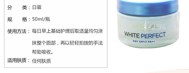 歐萊雅雪顏美白滋潤霜SPF17 粉嫩透白日霜 淡斑保濕霜50ml—— 1.歐萊雅專有的紫外線吸收劑麥色濾SX,猶如一道防護屏障般幫助肌膚從源頭上減少黑色素的產生,從根本上預防肌膚變黑和色斑生成。 2.同時蘊含Vitamin C維生素C衍生物,幫助減緩肌膚變黑的速度。 |