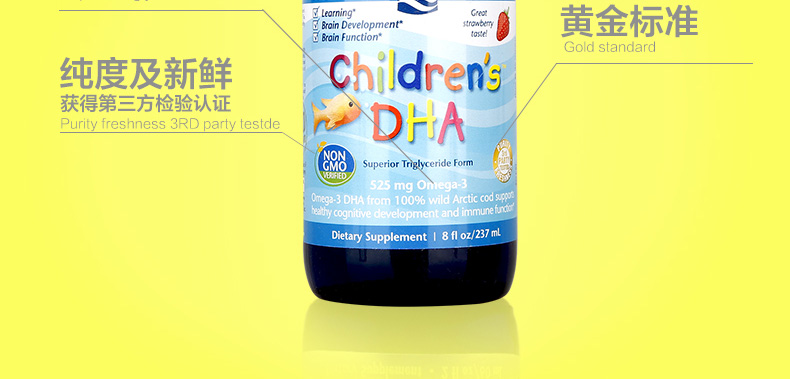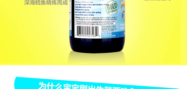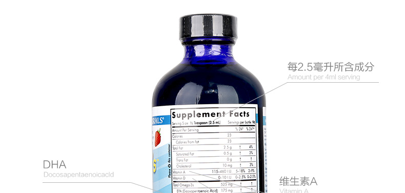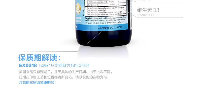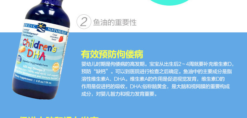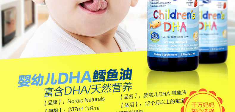 Nordic Naturals挪帝克 挪威中魚119ml/大魚237ml 嬰幼兒鱈魚油 DHA魚油—— 1.由北極圈內無污染海域的深海鯉魚精煉而成。 2.4小時垂直提取,生物活性高。 3.天然維生素A、D來源,分子鏈小,更利于寶寶腸胃吸收。 4.液體DHA易吞服易吸收,天然草莓味,寶寶更愛吃。 5.促進鈣的吸收,有效預防佝僂病! 注:小魚(60ml)15天~8個月,中魚(119ml)8個月~3歲;大魚 (237ml)3歲以上 |