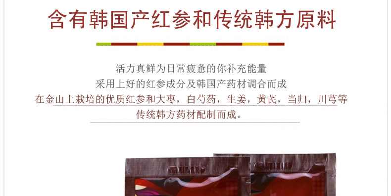 韓國[Duham] 活力真鮮紅參飲品增強體質 50mlx30包—— 1、增強免疫力,增強體力、調節氣息、改善體質、消除疲勞; 2、改善血液循環,,改善機體功能,改善貧血引起的全身代謝異常; 3、改善肝功能,具有解毒、保護肝臟及促進肝再生的作用;此外高麗參還有解救、消除宿醉、緩解酒后頭痛的作用; 4、養心安神,人參有安定心神,強化心臟的功能,對神經衰弱、神經過敏、消除壓力很有效; 5、延緩衰老,高麗參可一直有害自由基的生產和脂質過氧化,起抗氧化活性作用,可因此對預防老化有卓越的功效。