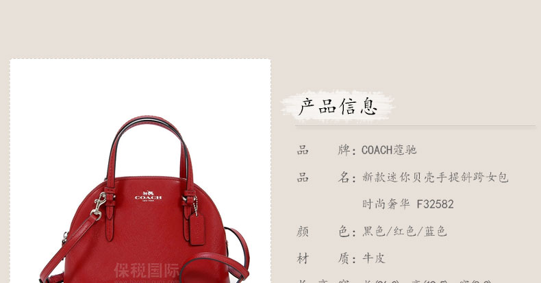美國 COACH/蔻馳 新款迷你單肩斜跨手提包 女士小號貝殼包 F32582—— 1.COACH(蔻馳)于1941年始于紐約,以其代表的紐約時尚及精湛的手工藝傳承而著稱,如今已成為全球領(lǐng)先的美國精致奢華手袋、配飾和禮物的品牌。 2.COACH一向以簡潔、耐用的風(fēng)格特色贏得消費者的喜愛。 |