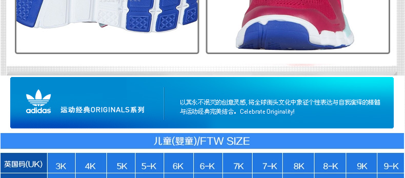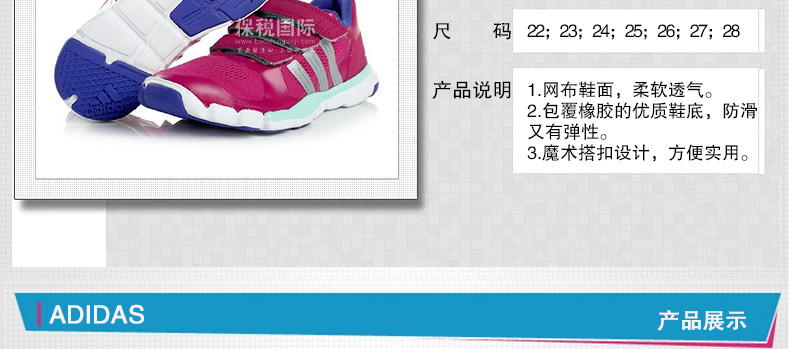 Adidas阿迪達斯三葉草兒童運動鞋 m18390 4-9歲 跑步訓練鞋—— 1.網布鞋面,柔軟透氣。 2.包覆橡膠的優質鞋底,防滑又有彈性。 3.魔術搭扣設計,方便實用。 |