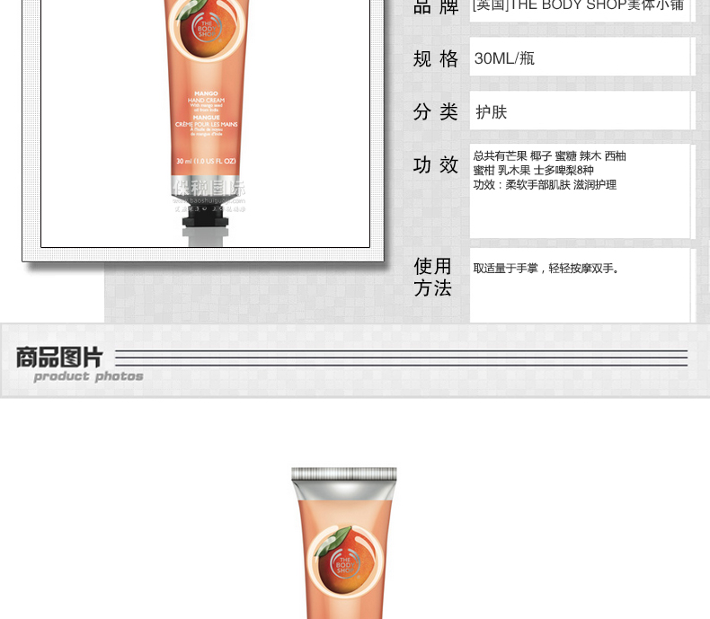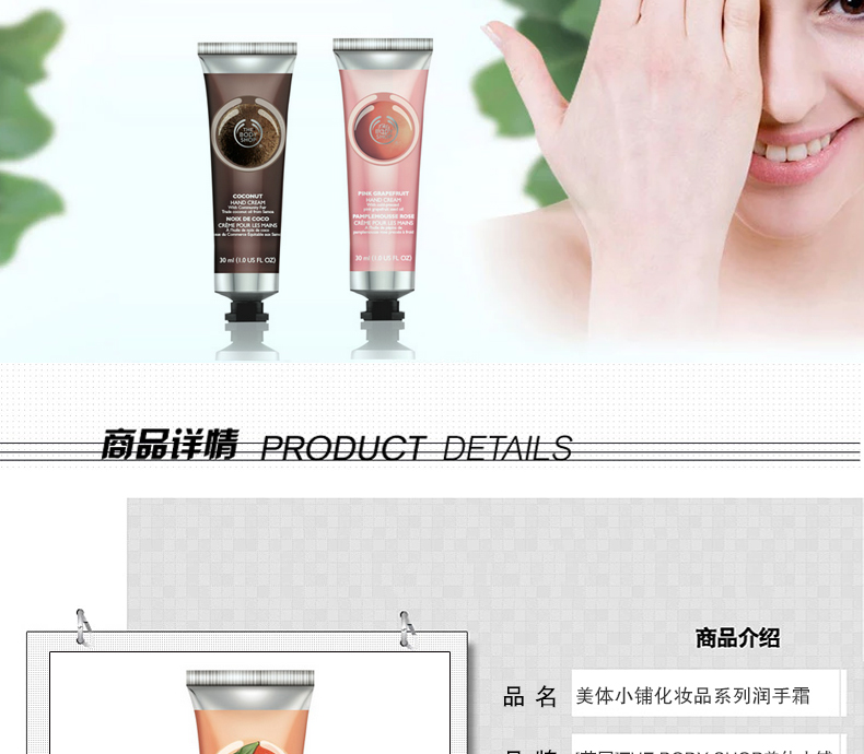 英國 The Body Shop 美體小鋪潤手霜 30ml 呵護滋潤雙手? 帶有怡人香味—— 水潤不黏膩,質感輕盈,易吸收。 |