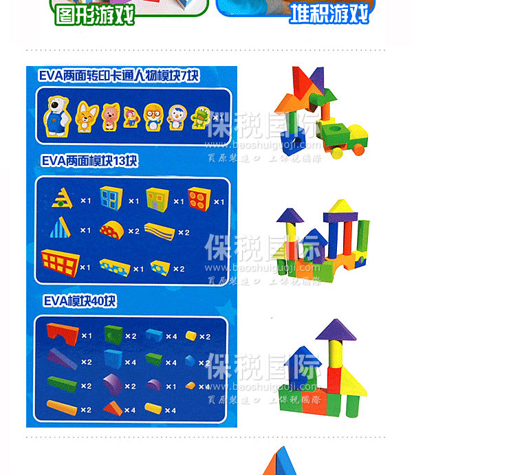 韓國pororo/寶露露小企鵝兒童益智玩具柔軟積木 —— EVA兩面轉(zhuǎn)印卡通人物模塊7塊 EVA兩面模塊13塊 EVA模塊40塊 考慮到孩子們的健康的輕便且安全的小企鵝柔軟積木。 用豐富的想象力,隨便制造波魯魯村莊、漂亮的屋子和火車、汽車。 1. 積木游戲:用豐富的想象力,隨便制造波小企鵝村莊、漂亮的屋子和火車、汽車。 2. 沐浴游戲:在水中也可以漂浮著玩。沾上水的話,可以緊緊地貼在瓷磚墻上玩。 3. 圖形游戲:觸摸四角、三角、圓形、圓柱、多種顏色的圖形,感受滋潤感。 4. 堆積游戲:1、2整整齊齊,歪歪曲曲壘搭的非常高。 |