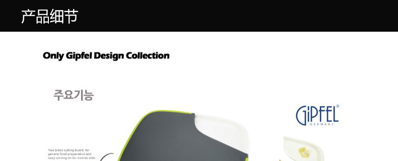 [德國GIPFEL]Fresh Up 兩面用切菜板廚房菜板面板案板—— 1、采用PP聚丙烯,TRP材料; 2、菜板末端設(shè)有裝菜肉等垃圾的裝備; 3、菜板背面切肉類專業(yè)設(shè)計,方便實(shí)用。 |