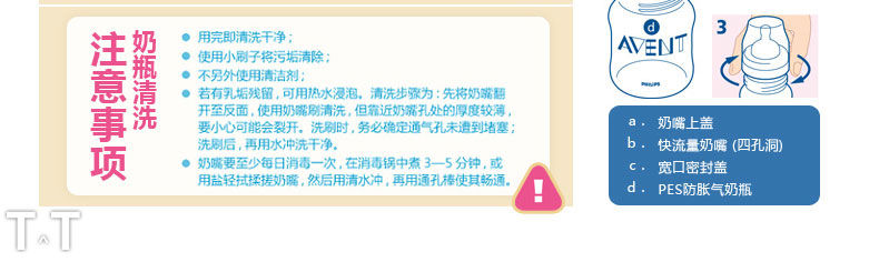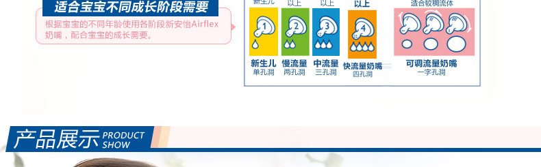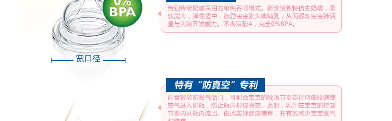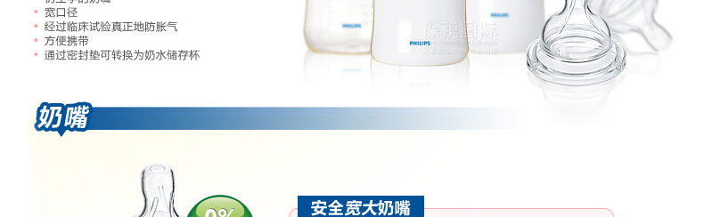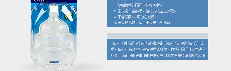 avent飛利浦新安怡奶嘴 經(jīng)典寬口徑 防脹氣硅膠嬰兒奶嘴 2孔對裝—— 1.奶嘴獨特的閥門可輕松吸收。 2.柔軟寬口徑奶嘴,輕松安撫寶寶焦躁。 3.不含雙酚A,可放心使用。 4.寬口徑奶嘴,適用于經(jīng)典系列奶瓶 |
