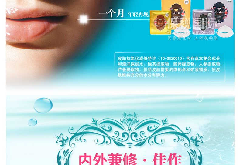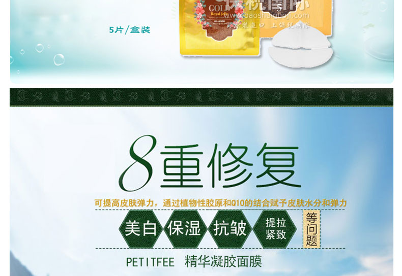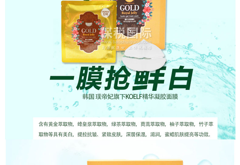 韓國(guó) 璞帝妃旗下KOELF精華凝膠面膜 黃金&蜂皇漿/珍珠&乳木果油—— 黃金&蜂皇漿:含有黃金萃取物,蜂皇漿萃取物,綠茶萃取物,茼蒿萃取物,柚子萃取物,竹子萃取物等具有美白,提拉抗皺、緊致皮膚,深層保濕,滋潤(rùn),蜜蠟肌膚提亮等功效。 珍珠&乳木果油:含有珍珠粉沫,乳木果油,黃金萃取物,綠茶萃取物,茼蒿萃取物,竹子萃取物等,具有美白,淡化斑痕,痘印,深層滋潤(rùn),延緩衰老,祛皺紋,抗敏感的功效。 |