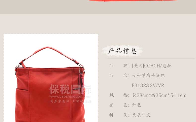 美國 COACH蔻馳 單肩手提包 斜跨女包 F31323 SV/VR—— 1.內部結構: 拉鏈暗袋、手機袋、證件袋。 2.COACH(蔻馳)于1941年始于紐約,以其代表的紐約時尚及精湛的手工藝傳承而著稱,如今已成為全球領先的美國精致奢華手袋、配飾和禮物的品牌。 |