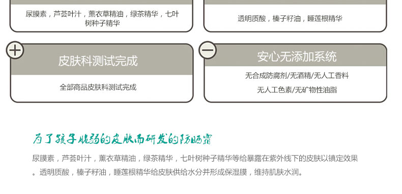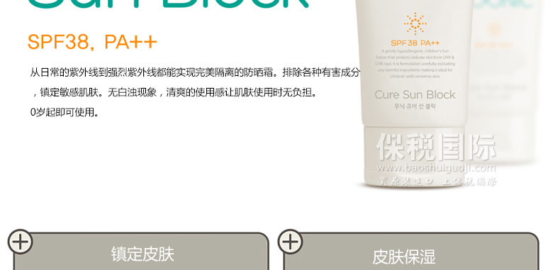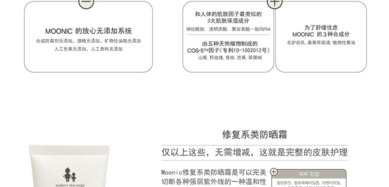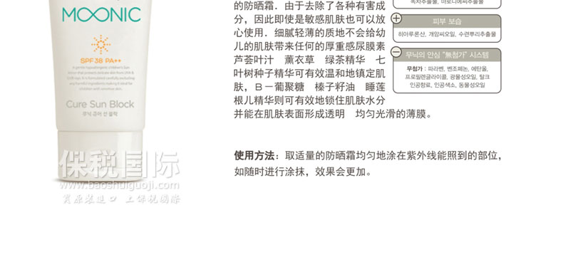 Moonic skin care cure Bath/ 修復(fù)系列曬霜SPF38 PA++ 0歲起即可使用 60ml/支—— 1.尿膜素,蘆薈葉汁,薰衣草精油,綠茶精華,七葉樹種子精華等給暴露在紫外線下的皮膚以鎮(zhèn)定效果。 2.透明質(zhì)酸,榛子籽油,睡蓮根精華給皮膚供給水分并形成保濕膜,維持肌膚水潤。 |