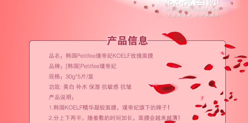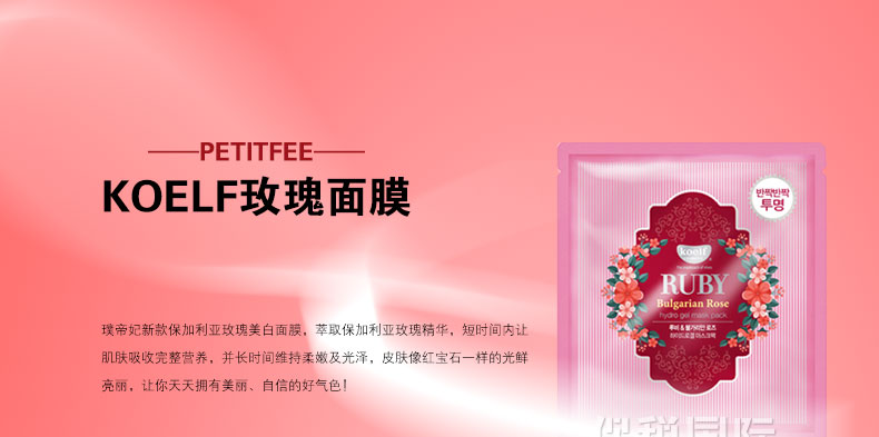 韓國Petitfee璞帝妃 KOELF精華凝膠面膜貼 美白玫瑰面膜(5片/盒)—— 1.韓國KOELF精華凝膠面膜,璞帝妃旗下的牌子! 2.分上下兩半。隨著敷的時間加長,面膜會越來越薄! 3.具有美白、保濕、滋養皮膚的功效。 |