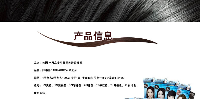 韓國 水果之鄉可芬CONFUME 天然植物染發劑 墨魚汁染發膏—— 1.不含PPD、低過敏性反應 2.本品不含刺激性較大的尿素,最大限度地降低了染發劑對人的眼睛和頭皮的刺激。 3.維生素E(藍色膠囊)和維生素C(橙黃色膠囊)使染發劑的著色效果鮮明而又靚麗。 |