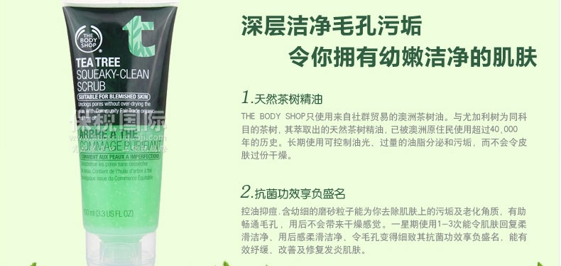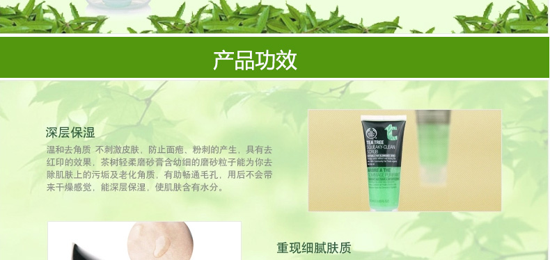 英國 The Body Shop 美體小鋪茶樹輕柔磨砂膏 細致毛孔 祛除角質 祛除黑頭 滋潤補水 100ml—— 1.幼細的磨砂粒子可以去除肌膚上的油污,暢通毛孔,從而達到預防痘痘,細致毛孔,光滑肌膚的效果。 2.茶樹油精華還具有殺菌消炎的作用,能有效舒緩、改善發炎肌膚。 |