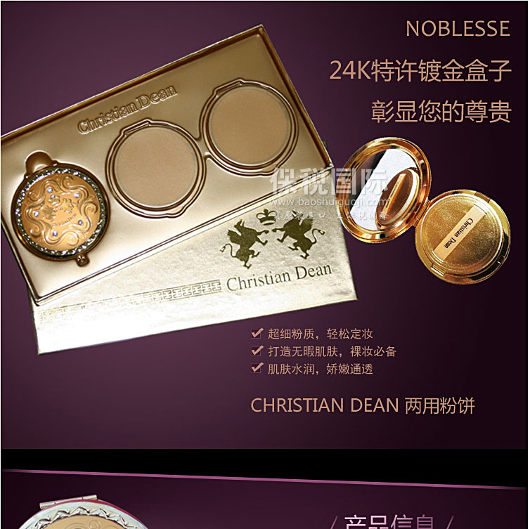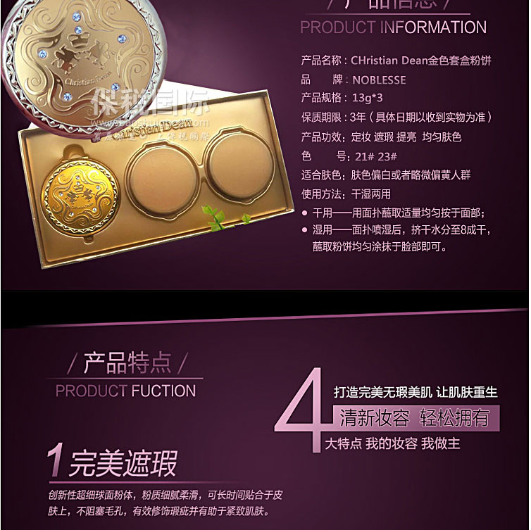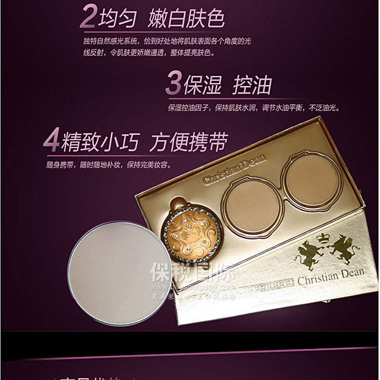 韓國CHRISTIAN DEAN 遮瑕美白干濕兩用粉餅13g*3個—— CHRISTIAN DEAN 兩用粉餅? 給您奢華的名牌形象的大方貴族感,讓皮膚呈現華麗和高貴,24K的特許鍍金盒子,意味著貴族和富有,提升使用者的人格和品位。 使用方法:干濕兩用 1.干用---用面撲蘸取適量均勻按于面部; 2.濕用---面撲噴濕后,擠干水分至8成干,蘸取粉餅均勻涂抹于臉部即可。 |