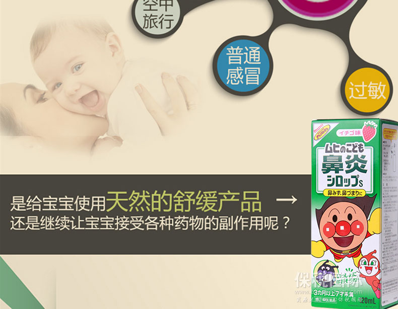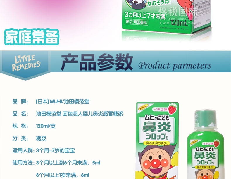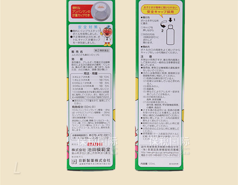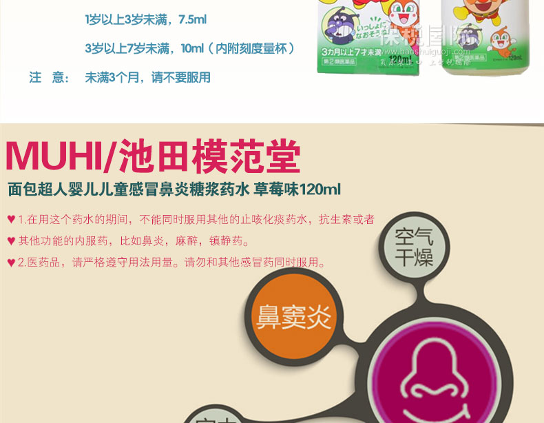 日本 池田模范堂 面包超人嬰兒兒童感冒鼻炎糖漿藥水 草莓味120ml —— 1.在用這個藥水的期間,不能同時服用其他的止咳化痰藥水,抗生素或者其他功能的內服藥,比如鼻炎,麻醉,鎮靜藥。 2.醫藥品,請嚴格遵守用法用量。請勿和其他感冒藥同時服用。 |