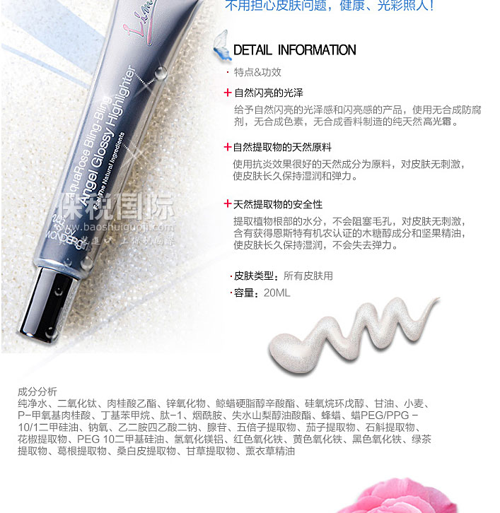 韓國人氣AquaRose水玫瑰閃亮天使高光亮膚修顏遮瑕霜—— 1. 內(nèi)含木糖醇和堅果精油,使肌膚長久保持滋潤,彈力。 2. 富含植物天然水分,不會堵塞毛孔,無刺激。 3. 強力遮瑕,提亮肌膚,打造自然閃亮肌膚。 4. “六無”產(chǎn)品,無色素,無防腐劑,無酒精,無礦物油,無香料,無引起青春痘成分。 |