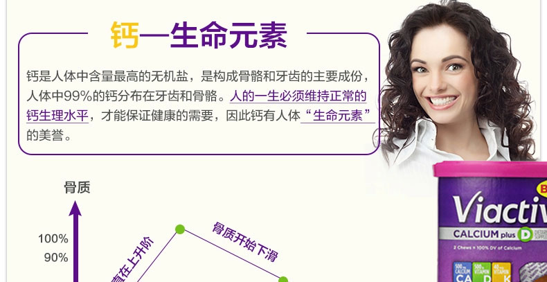 美國 Viactiv 女士補鈣軟糖(太妃味) 咀嚼鈣 牛奶巧克力軟糖 115粒 —— 1.同時在鈣中特別添加了維生素D和維生素K。維生素D能夠促進鈣被充分吸收,而維生素K則可以幫助鈣充分被人體所利用。維生素D被證明對女性的胸部健康很有幫助作用。 2.viactiv讓你同樣的補鈣而不需要服用那些討厭的藥丸,在一個美味、方便的方式下,你可以在任何地方享受viactiv。每天兩次,就可以提供100 %的每日身體所需的鈣。 |