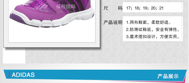 Adidas 阿迪達斯兒童運動鞋 柔軟舒適 輕便 m22480 1-3歲—— 1.網(wǎng)布鞋面,柔軟舒適。 2.防滑紋鞋底,安全有彈性。 3.魔術(shù)搭扣設(shè)計,方便實用。 |