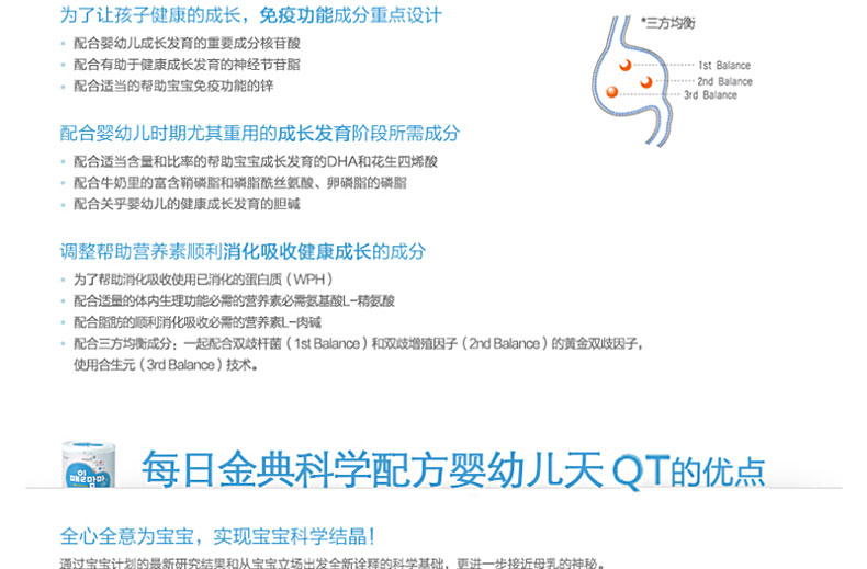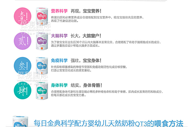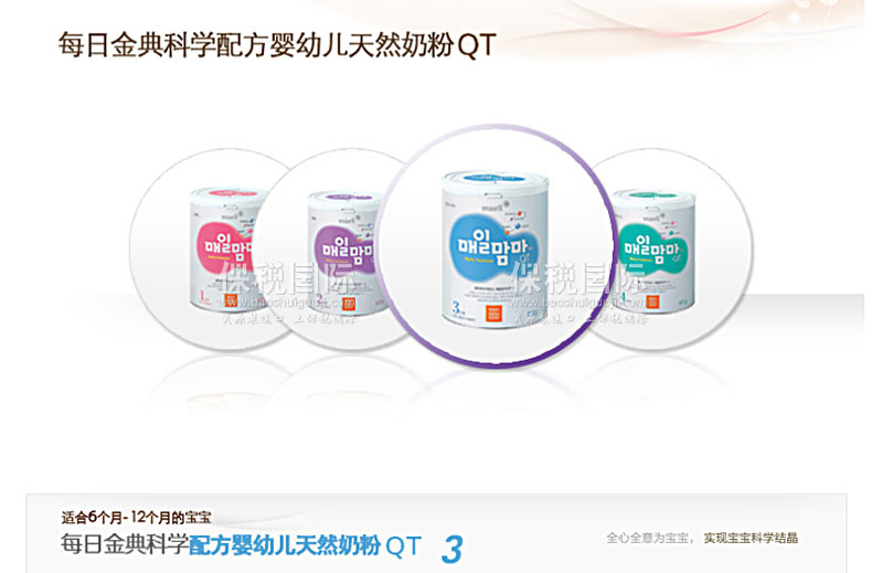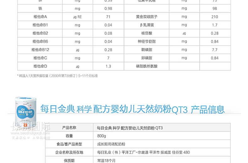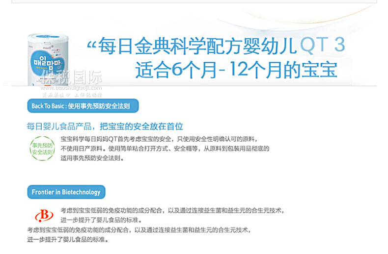 韓國(guó)每日金典 科學(xué)配方 嬰幼兒天然奶粉 QT 3階段—— 1. 科學(xué)免疫:強(qiáng)壯寶寶身體!適合6個(gè)月到12個(gè)月的寶寶。 2. 補(bǔ)充抑制細(xì)菌感染的神經(jīng)節(jié)苷脂和免疫功能活性化成分核苷酸,打造讓寶寶茁壯成長(zhǎng)的堅(jiān)實(shí)基礎(chǔ)。 3. 每日嬰兒食品產(chǎn)品,把寶寶的安全放在首位。 4. 為了讓孩子健康的成長(zhǎng),對(duì)免疫功能成分進(jìn)行重點(diǎn)設(shè)計(jì)。 5. 配合嬰幼兒時(shí)期尤其重用的成長(zhǎng)發(fā)育階段所需成分。 6. 調(diào)整幫助營(yíng)養(yǎng)素順利消化吸收健康成長(zhǎng)的成分。 6. 科學(xué)的配合了營(yíng)養(yǎng)素的消化吸收,健康成長(zhǎng)。 |