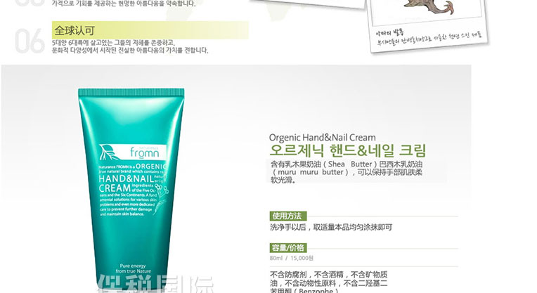 | 產品說明 | 韓國fromn乳木果油保濕滋養護手霜 80ml?—— 含乳木果油精華配方,潤而不膩,令肌膚產生自然光澤和彈性,深層呵護雙手,改善干燥凍裂,持續潤澤。 使用方法:雙手洗凈后,取適量輕輕涂抹于手部,輕揉至吸收,隨時隨地都可使用。本品亦可用于身體其他部位,如腿部、足部、肘部。 ? | |||