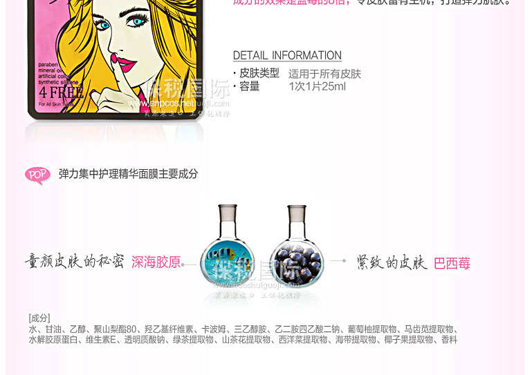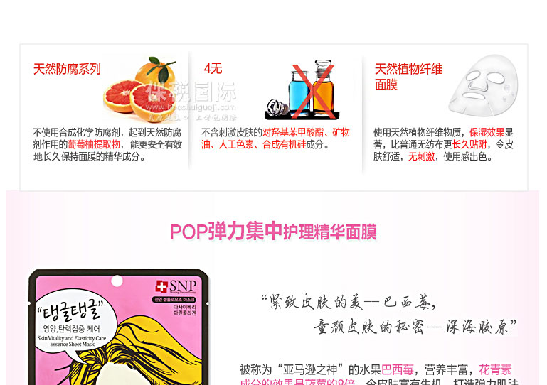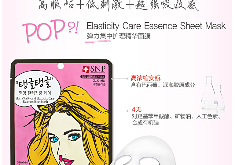 韓國藥妝SNP POP 天然植物纖維 彈力護理精華面膜(5片裝)—— 天然植物纖維面膜,使用天然成分,可減輕對皮膚的刺激,以及高密度純棉面膜卓越的貼服感與吸水力,提供皮膚所需營養,潤滑肌膚。含有巴西莓抑制老化引起的合成氧,深海膠原成分,使得松弛的臉部輪廓恢復彈力。透明質酸的保濕效果,從皮膚底層滋潤,滋潤干燥皮膚,恢復彈力,幫助抗老化。 |