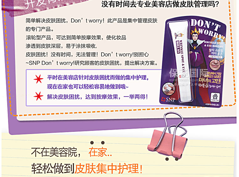 韓國 SNP 功能性抗皺走珠護理精華 20g—— 1.集中管理頸部皺紋的產品。 2.改善眼部皺紋、八字紋。 3.令日漸松弛的皮膚重現活力和彈力的集中護理。 4.對皮膚有害的成分消失吧~敏感的皮膚也可以安全使用的低刺激化妝品。 |