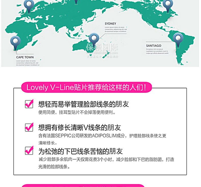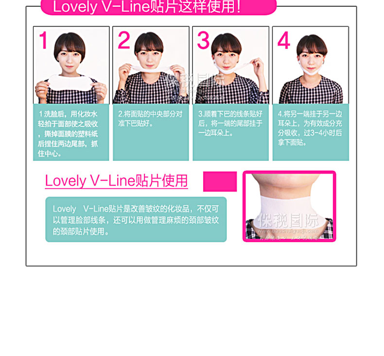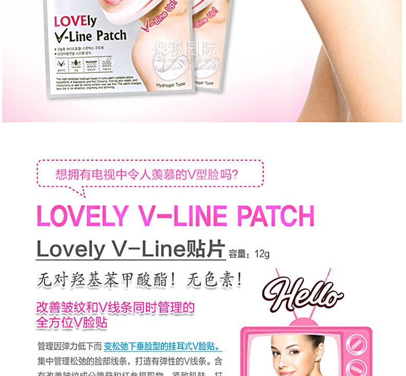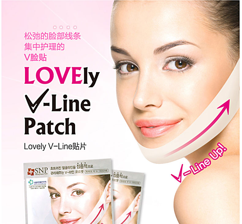 韓國人氣藥妝SNP Lovely系列瘦臉貼 V臉貼 12g—— 1. 改善皺紋和V線條同時管理的全方位V臉貼。 2. 管理因彈力低下而變松弛下垂臉型的掛耳式V臉貼。 3. 集中管理松弛的臉部線條,打造有彈性的V線條。 4. 含有改善皺紋成分腺苷和紅參提取物,緊致肌膚,打造完美的下巴線條。 5. 強化彈力、保濕、改善皺紋、打造V線條四功效合一。 |
